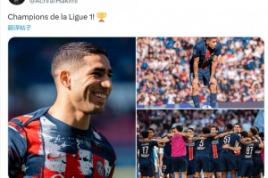 这是阿什拉夫2021年加盟巴黎以来第4次问鼎法甲,他在社交媒体上晒出比赛照片,配文:“法甲冠军!”